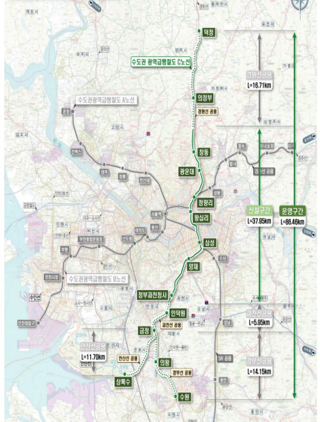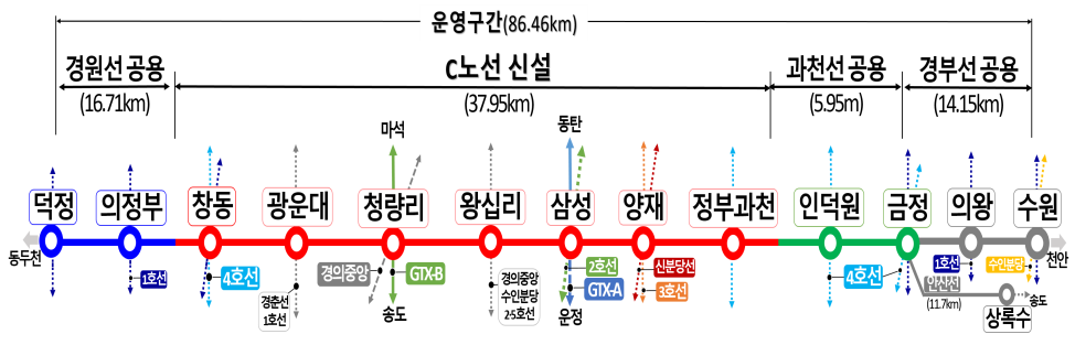 양주시 덕정역에서 시작하여 경기도 수원시 수원역까지 이어지는 86.46km의 GTX-C는 총 14개의 정거장이 모두 일반 지하철로 환승 가능한 역이며, 이 노선은 양주, 의정부와 같은 수도권 북부 지역에서 서울 도심까지 약 30분이면 도달할 수 있게 합니다.