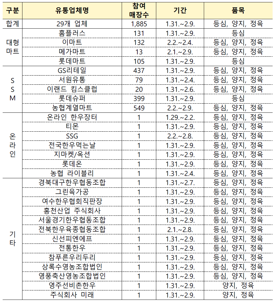 - 품목 : 등심, 양지, 정육(불고기‧국거리) 등