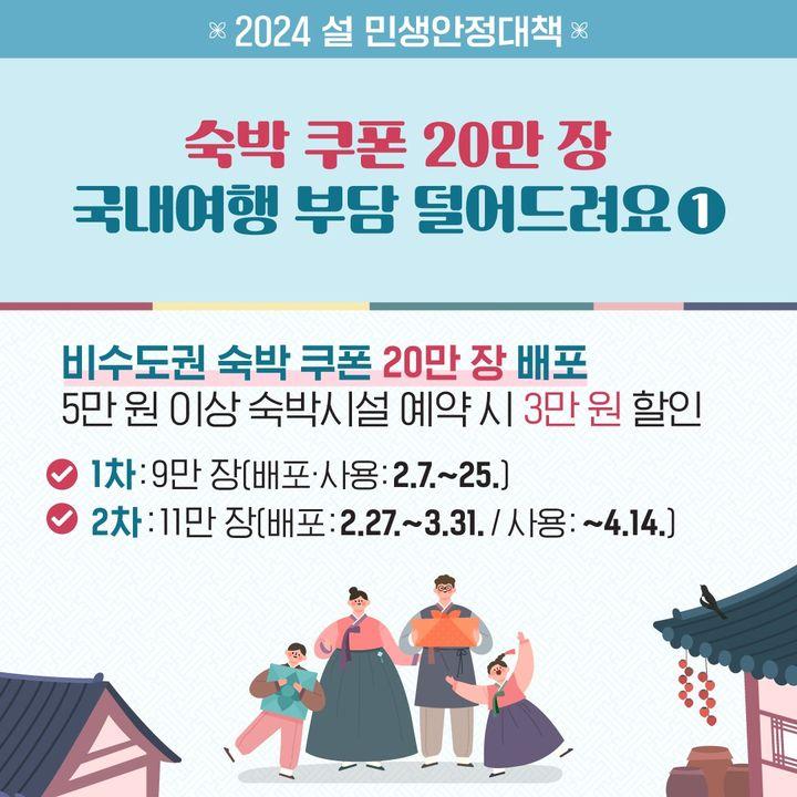 정부는 설 명절을 맞아 숙박 쿠폰 20만 장을 배포한다고 합니다. 숙박 쿠폰은 비수도권 지역으로 5만 원 이상 숙박시설을 예약할 경우 3만 원 할인 되는 쿠폰으로 숙박 쿠폰 지원 받아서 국내여행 부담 덜고 즐거운 여행 되시기 바랍니다.