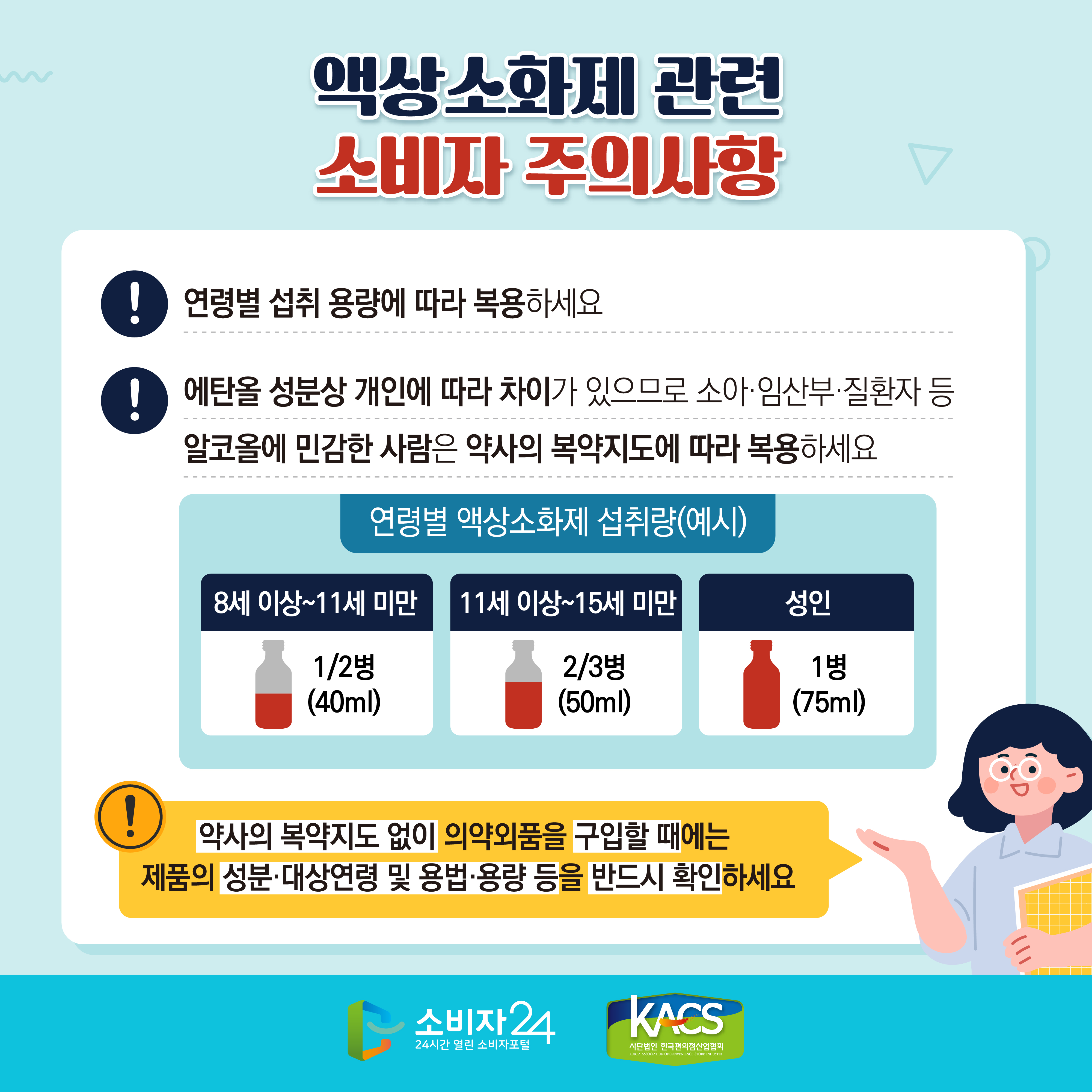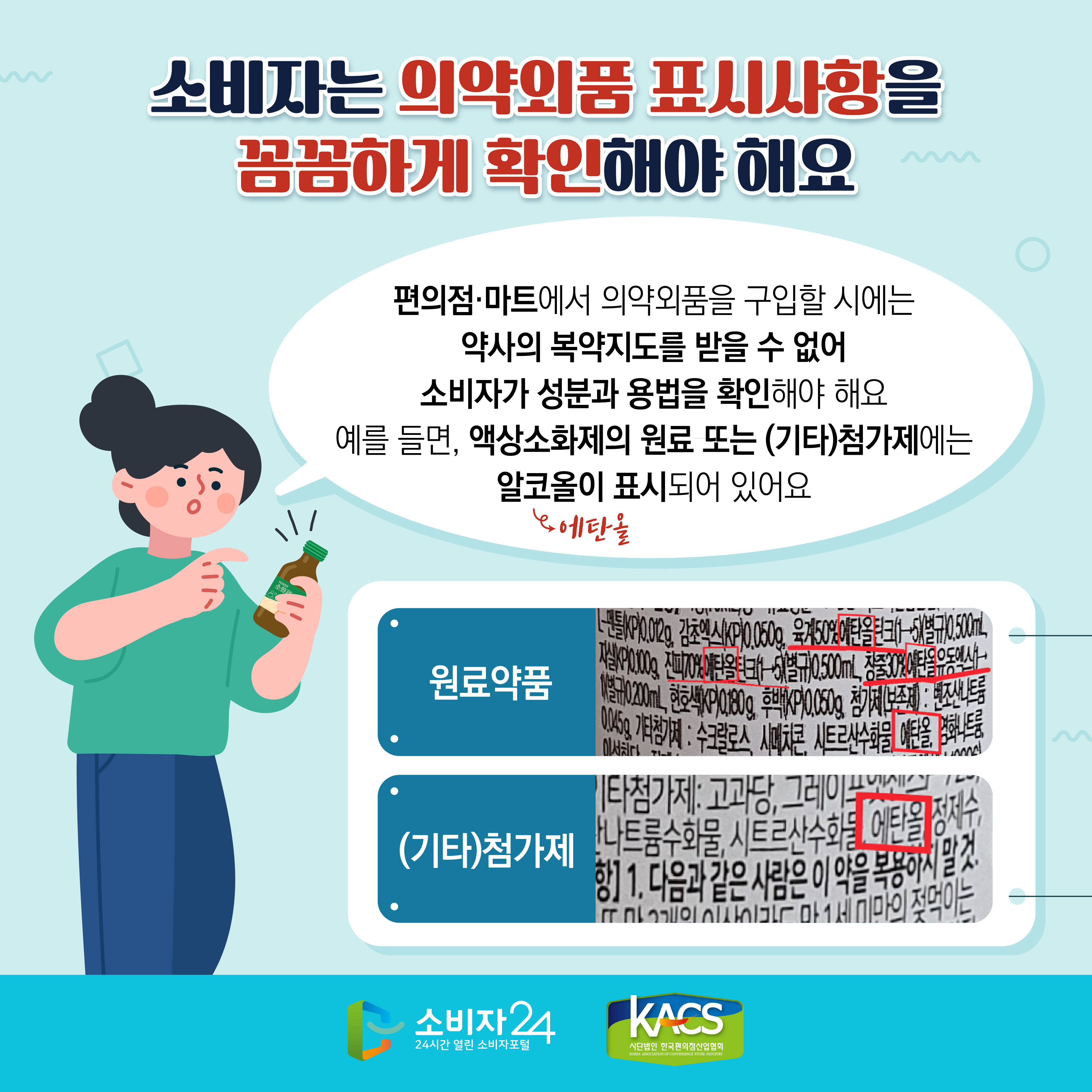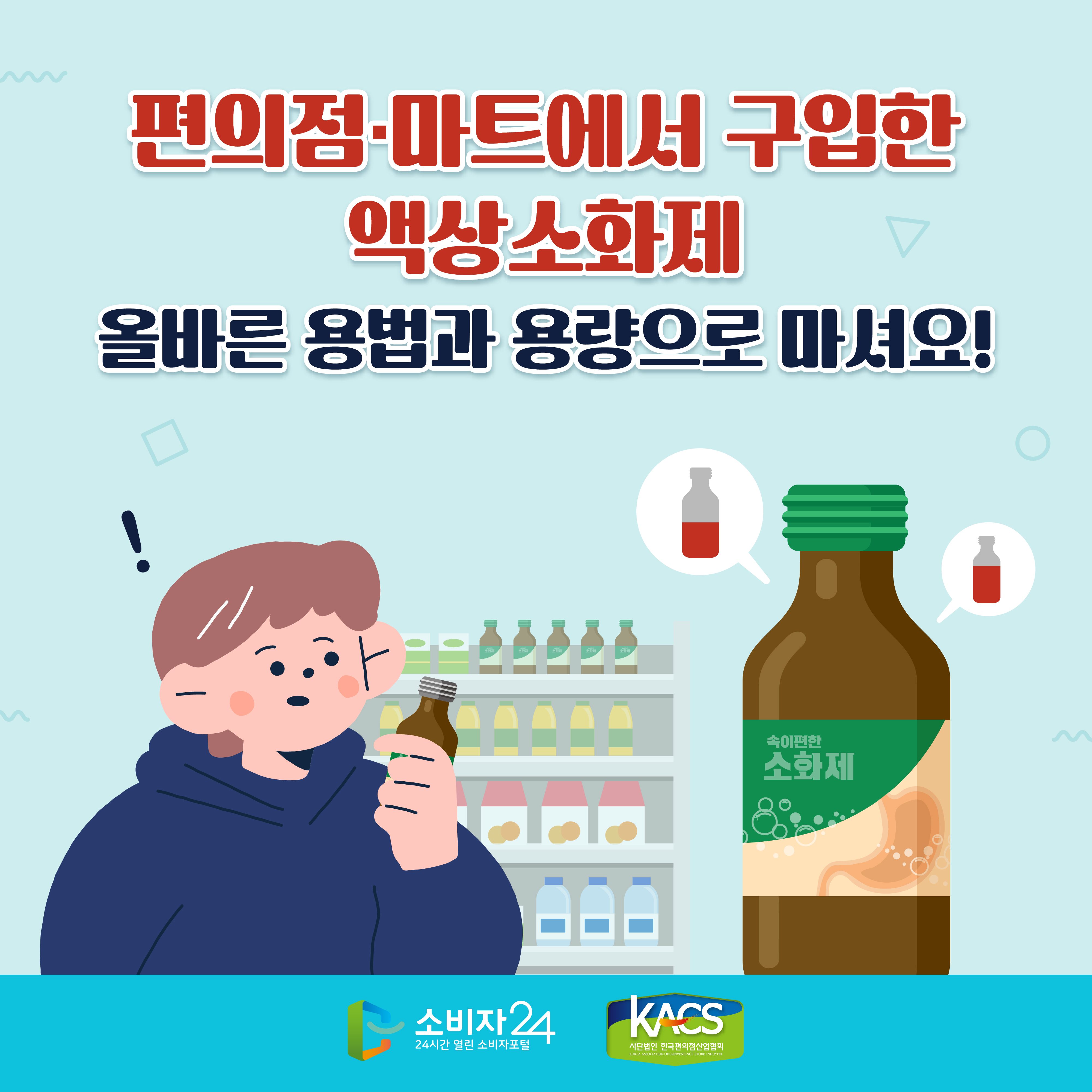 내용은 한국소비자원이 편의점이나 마트 등에서 판매하는 의약외품 액상소화제(7종)와 약국에서 판매하는 일반의약품 액상소화제(8종) 총 15종을 대상으로 조사한 내용을 바탕으로, 액상 소화제의 섭취 및 사용 현황, 그리고 소비자가 확인해야 할 성분, 사용법, 용량 등에 대해 자세히 소개합니다.