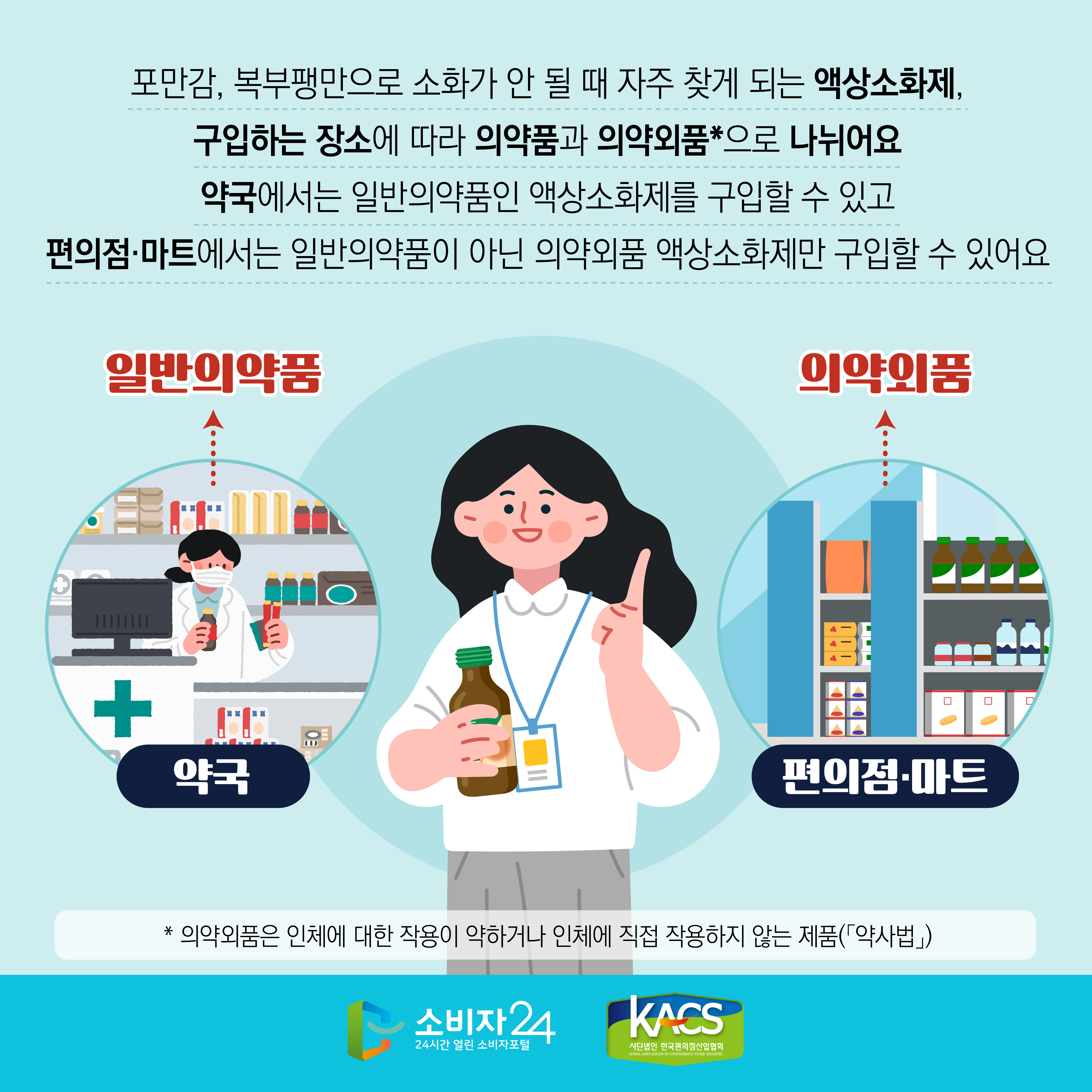 내용은 한국소비자원이 편의점이나 마트 등에서 판매하는 의약외품 액상소화제(7종)와 약국에서 판매하는 일반의약품 액상소화제(8종) 총 15종을 대상으로 조사한 내용을 바탕으로, 액상 소화제의 섭취 및 사용 현황, 그리고 소비자가 확인해야 할 성분, 사용법, 용량 등에 대해 자세히 소개합니다.
