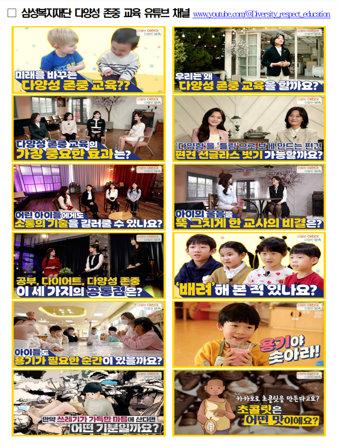 보육교사뿐만 아니라 부모들도 일상생활에서 자녀 지도 시 활용할 수 있도록 영상자료(12개)도 함께 제공합니다. 영상자료는‘다양성 존중 교육 유튜브(www.youtube.com/@Diversity_respect_education)’에서 누구나 시청할 수 있습니다.