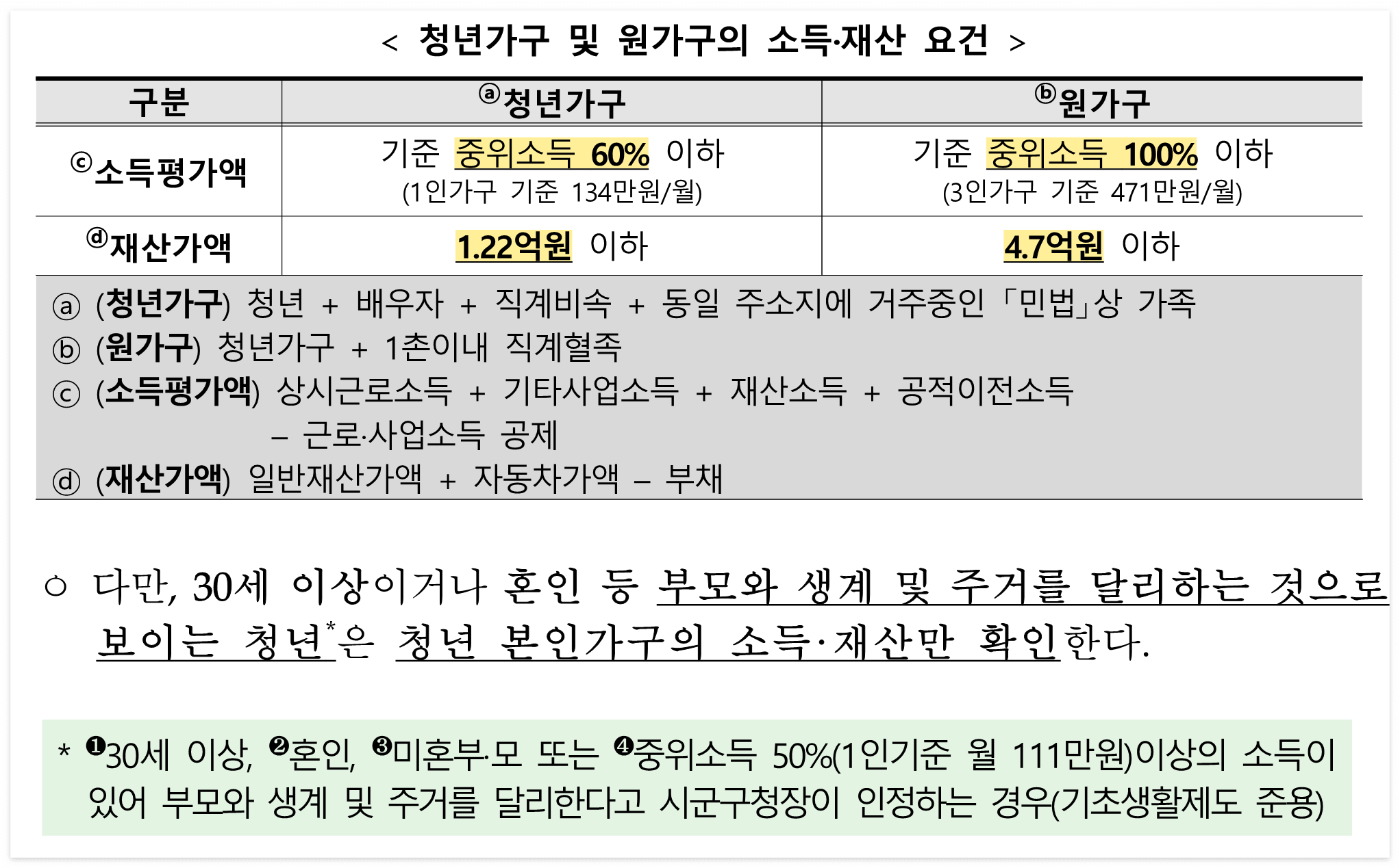 청년월세 특별지원을 받기 위해서는 청년 본인가구와 부모 등을 포함하는 원가구의 소득 및 재산을 고려합니다.
