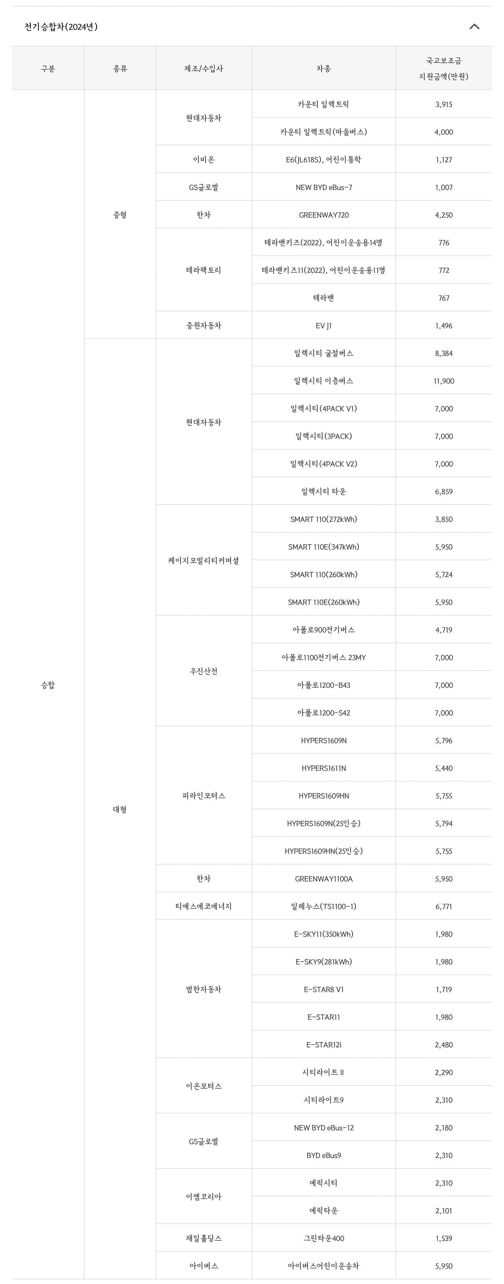 2024년 전기자동차 차종별 국고보조금