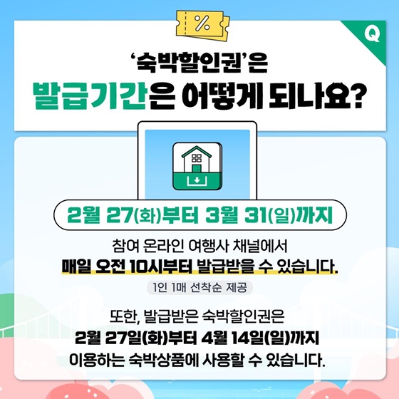 2024 대한민국 숙박세일 페스타의 숙박할인권은 2월 27일부터 3월 31일까지 2024 대한민국 숙박세일 페스타에 참여하는 온라인 여행사 채널에서 매일 오전 10시부터 1인 1매 선착순으로 발급받을 수 있습니다.