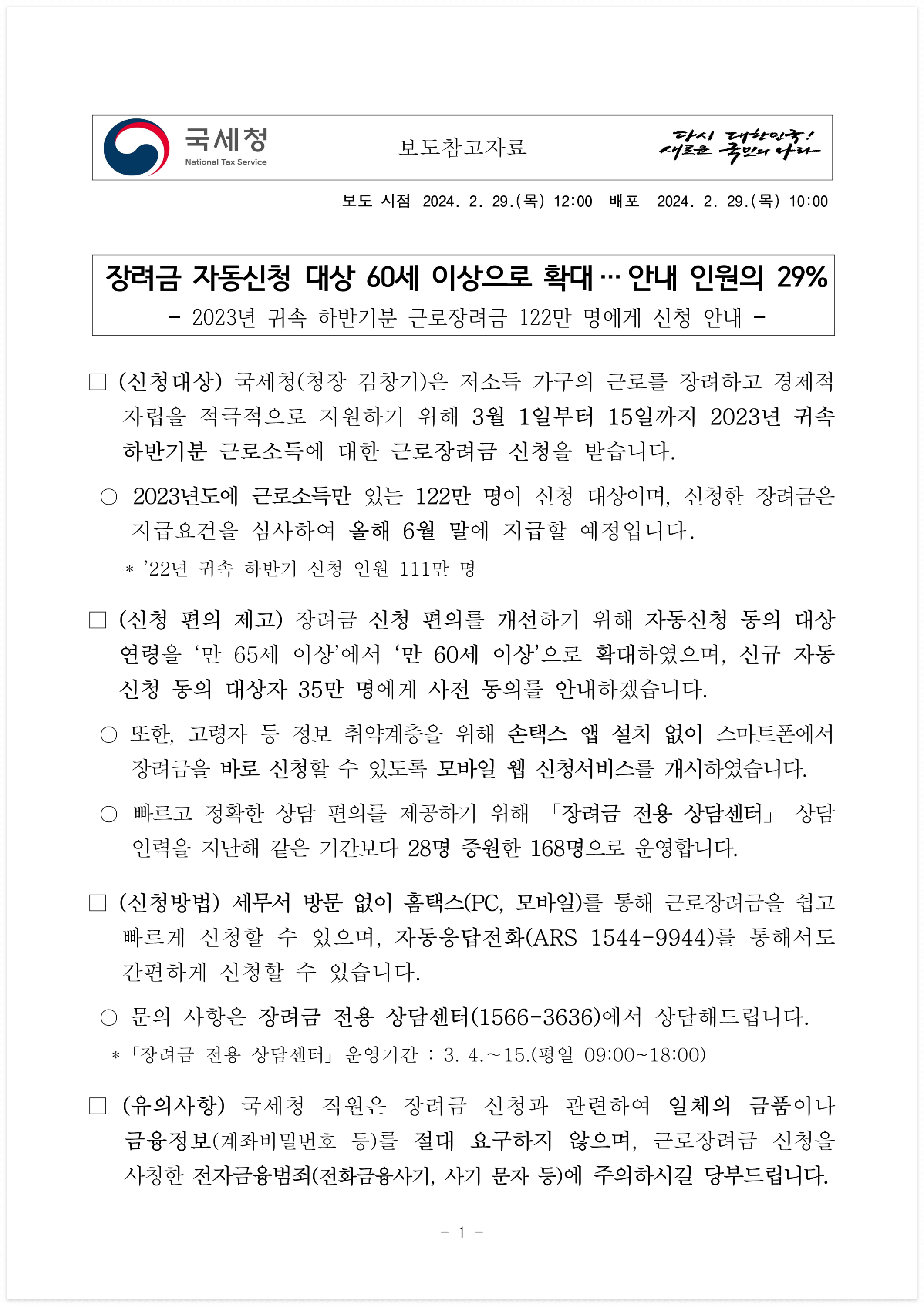 국세청은 저소득 가구의 근로를 장려하고 경제적 자립을 적극적으로 지원하기 위해 3월 1일부터 3월 15일까지 2023년 귀속 하반기분 근로소득에 대한 근로장려금 신청을 받는다고 합니다.