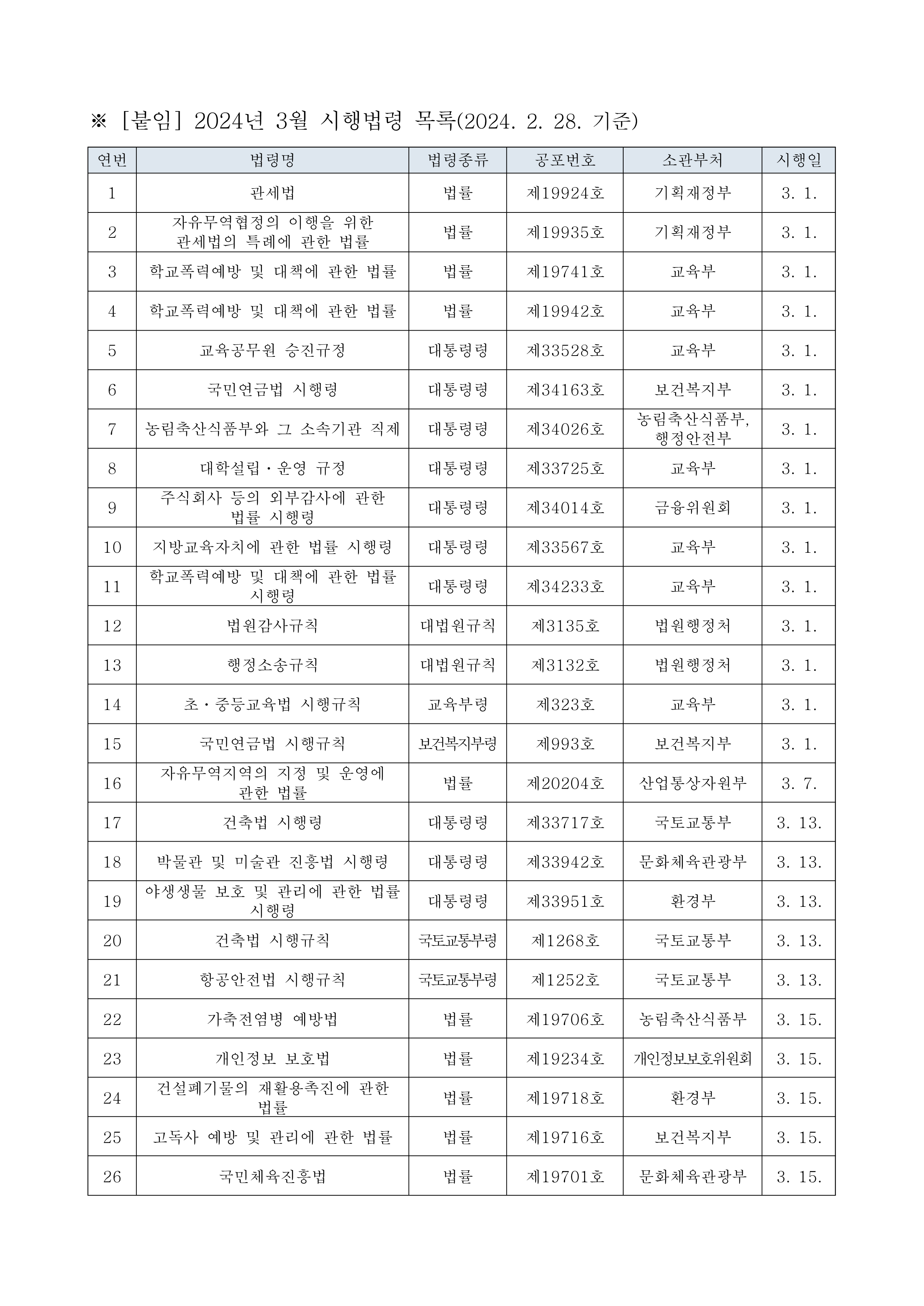 정부는 3월부터는 호텔에서 일회용 칫솔 등 편의 물품을 무료로 제공할 수 없으며, 1세대 1주택 장기보유자의 재건축 부담금이 최대 70%까지 감면된다고 합니다. 법제처는 이러한 내용을 포함하여 3월에 총 74개의 법령이 새로 시행된다고 밝혔다. 시행 예정 법령의 주요 내용과 시행일을 자세히 알아보겠습니다.