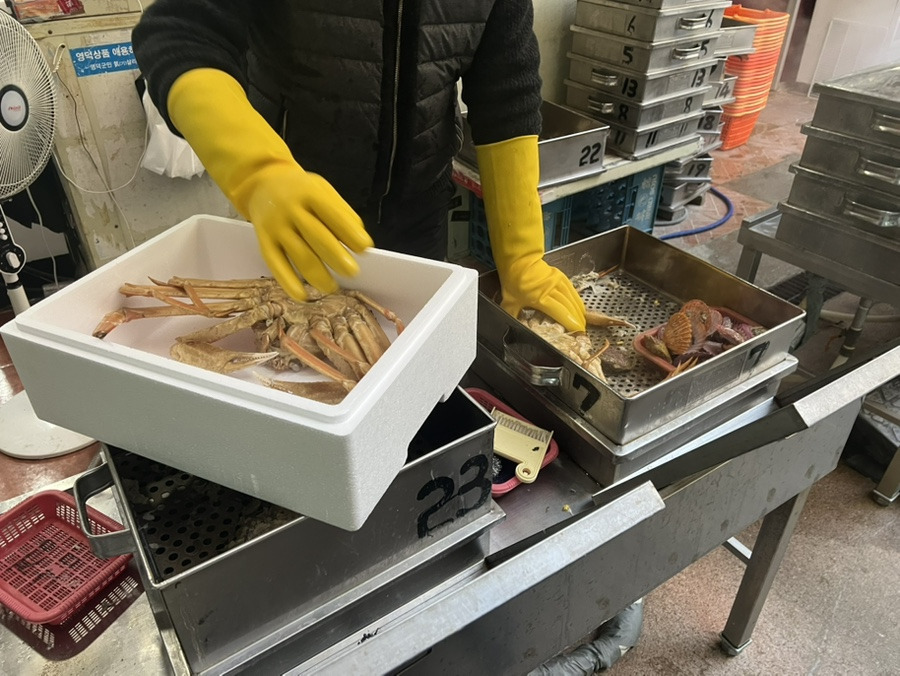 어시장에 들어가니 생물보다는 엄청난 대게들