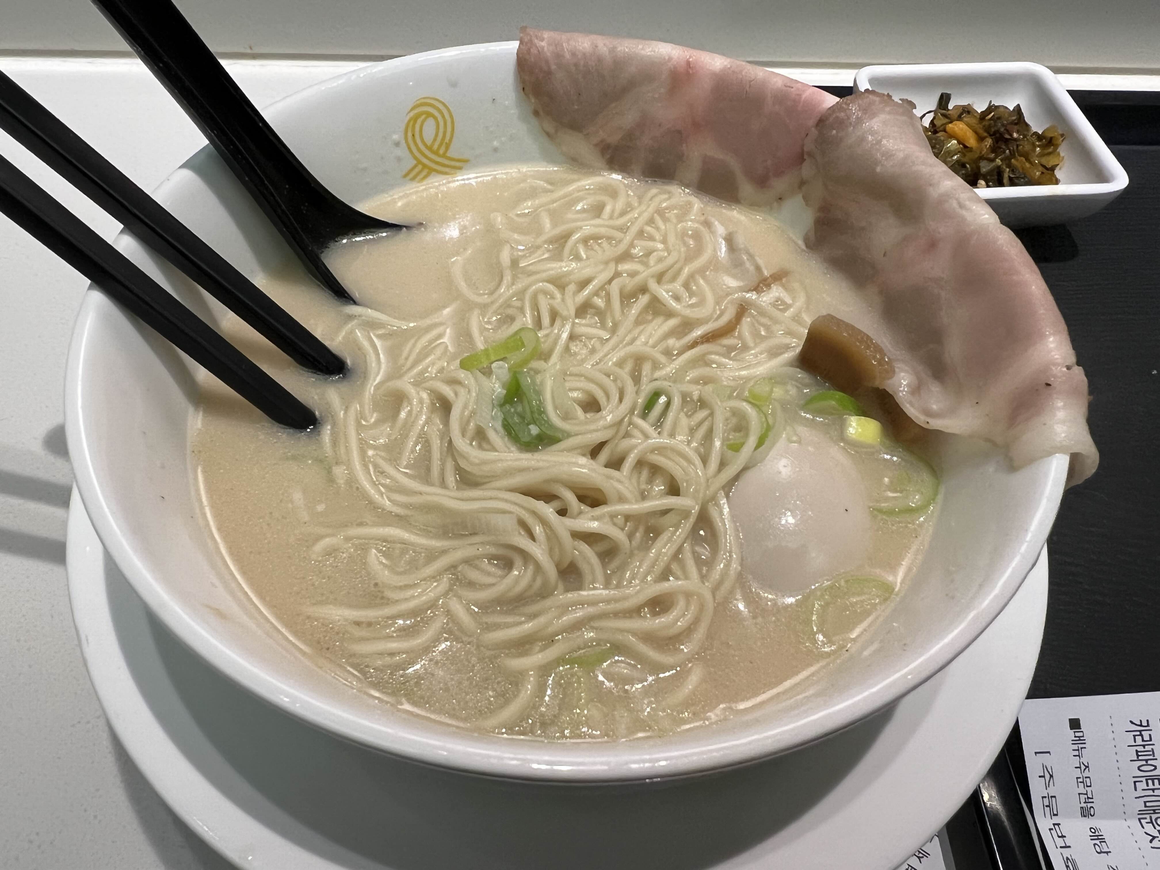 뽀얀 국물에 꼬들한 면발 그리고 반숙란이 들어있어요