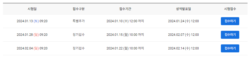 | 회차 | 시험일시 | 성적발표일시 | 접수기간 |