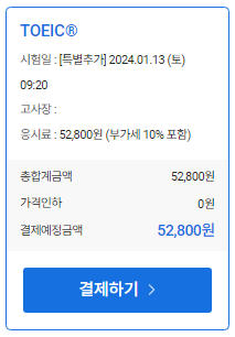 2024년 1월 기준 토익 금액은 정기접수 금액 48,000원, 특별추가접수 금액 52,800원 입니다.