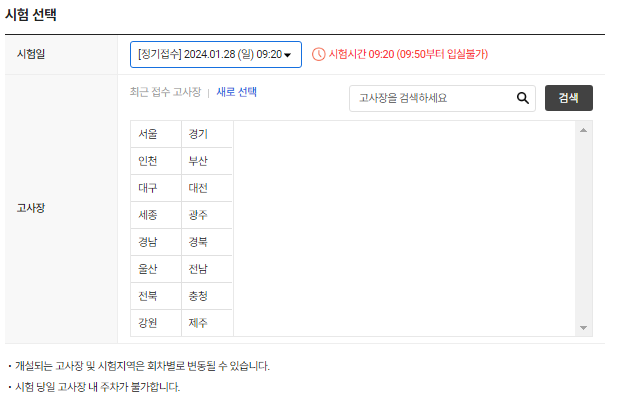 - 시험일자를 다시한번 확인하고 고사장을 선택합니다.