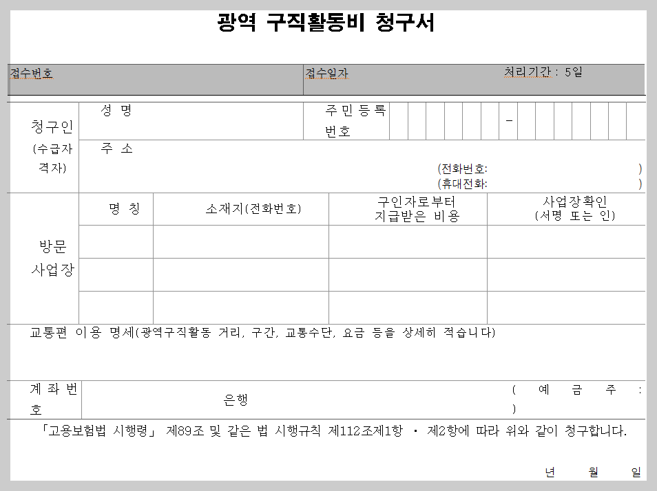 - 광역구직활동을 종료한 날부터 14일 이내에 고용보험 광역구직활동비청구서를 제출해야 합니다.