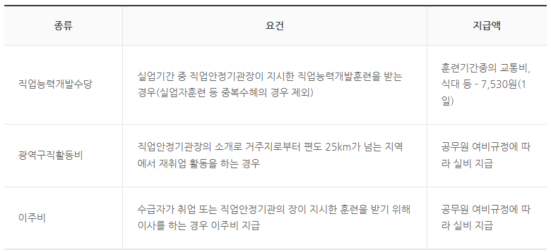 취업촉직수당에는 조기재취업수당, 직업능력개발수당, 광역구직활동비, 이주비 등이 있습니다.
