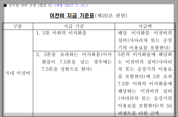 지급금액은 공무원여비규정 제20조제1항 관련 별표5에 따른 "이전비 지급기준표" 국내이전비 지급기준에 따라 실비를 기준으로 일정금액 지급