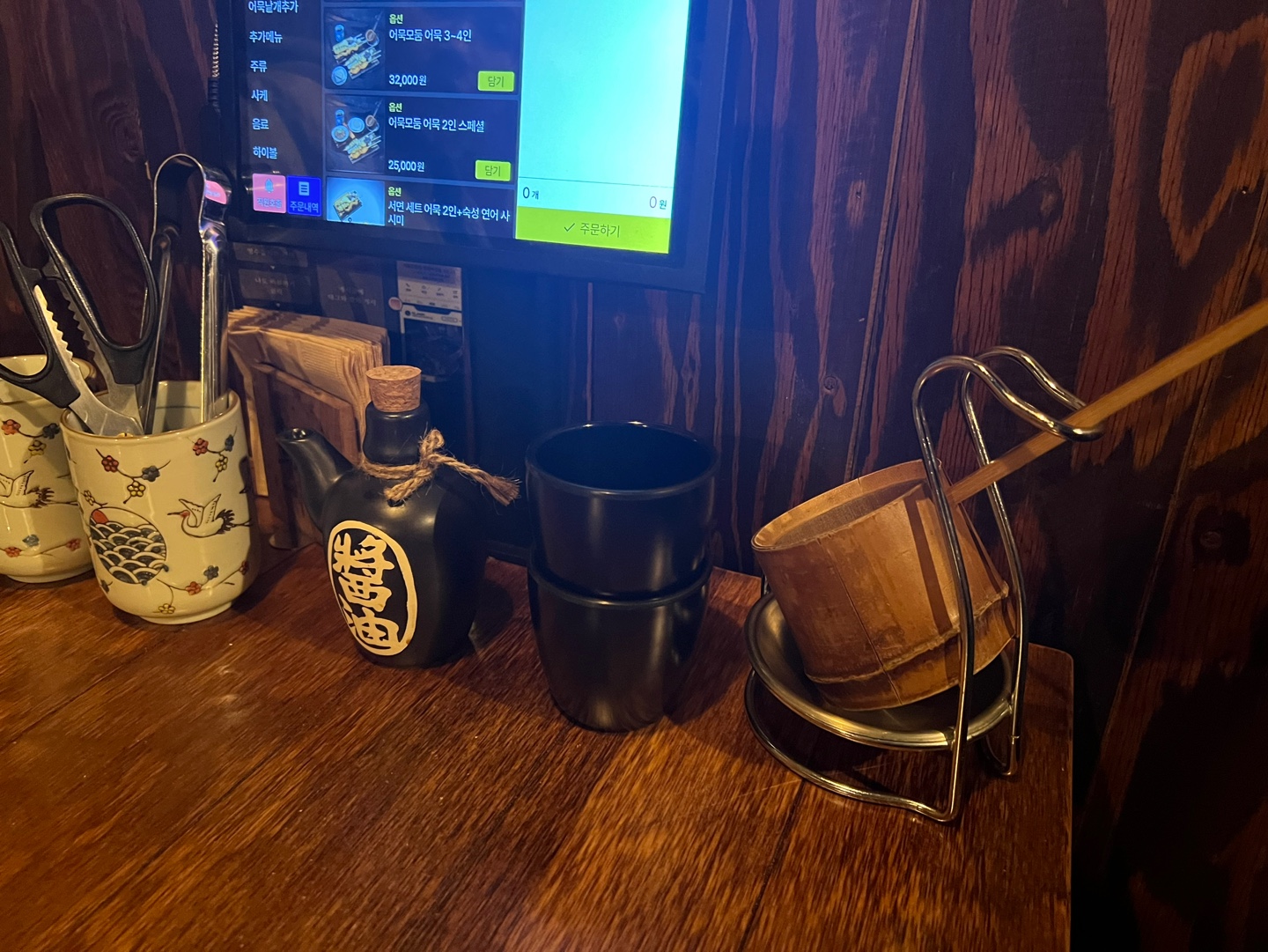 특이한 나무국자가 테이블마다 있고