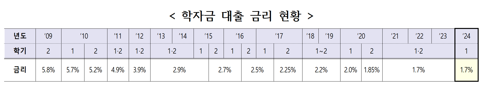2024년 1학기 학자금 대출 금리는 고물가와 고금리 시기에 어려운 학생들의 부담을 경감시켜 주기 위해서 2023년도와 동일하게 1.7% 저금리로 동결되었습니다.